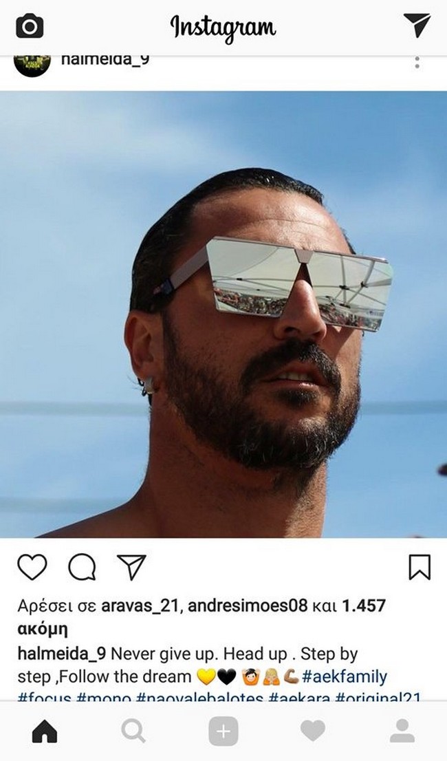 Μια φωτογραφία από το Κιέλτσε στην οποία τρέχει ανέβασε στο Instagram ο Ούγκο Αλμέιδα, γράφοντας χαρακτηριστικά: Ποτέ μη τα παρατάς. Ψηλά το κεφάλι. Βήμα προς βήμα, ακολούθησε το όνειρο», για να συνεχίσει βάζοντας τα απαραίτητα hashtags. #συγκέντρωση #αεκοικογένεια #αεκαρα και #original21