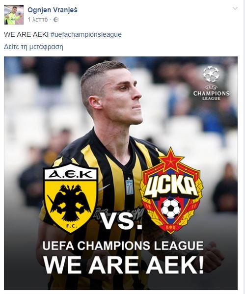 Δείτε το ποστάρισμα του Όγκνιεν Βράνιες στα Social Media με αφορμή την κλήρωση για τα προκριματικά του Τσάμπιονς Λιγκ η οποία φέρνει στο διάβα της Ένωσης την ΤΣΣΚΑ Μόσχας