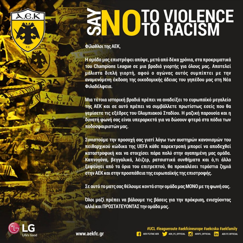 Μια τέτοια ιστορική βραδιά πρέπει να αναδείξει το ευρωπαϊκό μεγαλείο της ΑΕΚ και σε αυτό πρέπει να συμβάλλετε πρωτίστως εσείς που θα γεμίσετε τις εξέδρες του Ολυμπιακού Σταδίου. Η μαζική παρουσία και η δυνατή φωνή σας είναι υπεραρκετά για να δώσουν φτερά στα πόδια των ποδοσφαιριστών μας.