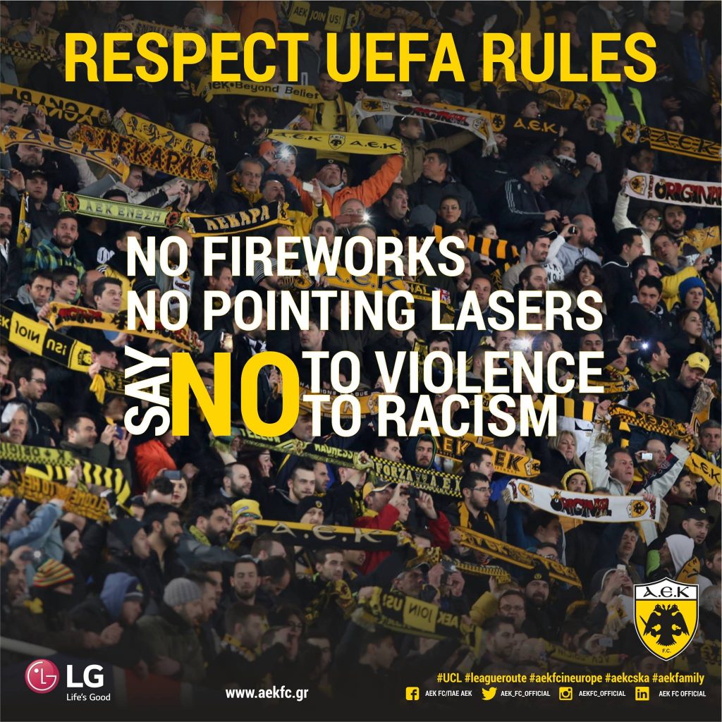 Συνιστούμε την προσοχή σας γιατί λόγω των αυστηρών κανονισμών του πειθαρχικού κώδικα της UEFA κάθε παρεκτροπή μπορεί να αποδεχθεί καταστροφική και να στοιχίσει πάρα πολύ στην αγαπημένη μας ομάδα. Καπνογόνα, βεγγαλικά, λέιζερ, ρατσιστικά συνθήματα και ό,τι άλλο ξεφεύγει από τα όρια του επιτρεπτού, θα προκαλέσει τεράστια ζημιά στην ΑΕΚ και στην προσπάθεια της ευρωπαϊκής της επιστροφής.