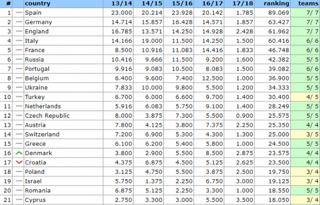 Την ίδια στιγμή μειώθηκε κατά 100 βαθμούς και η απόσταση από τη 16η θέση, όπου πλέον πέρασε η Δανία (23.575) αντί της Κροατίας (23.500) που ήταν μέχρι χθες. Όσο για τη 12η θέση, η Τσεχία παρέμεινε στους 25.575 βαθμούς κι ως εκ τούτου η Ελλάδα πλησίασε οριακά. Αυτός είναι κι ο μεγάλος στόχος της Ελλάδας τη δεδομένη στιγμή, καθώς εφόσον μπει στη 12άδα, θα επαναφέρει στους ομίλους του Europa League τον Κυπελλούχο από τη σεζόν 2018-19.