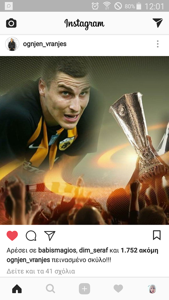 Ο Ογκνιεν Βράνιες είναι διψασμένος για νίκες και διακρίσεις και αυτό το δείχνει και σε κάθε παιχνίδι που αγωνίζεται. Μάλιστα ο Βόσνιος στόπερ της ΑΕΚ ανέβασε μια φωτογραφία στο Instagram ενόψει των αγώνων για το Europa League με την Μπριζ και έγραψε: «Πεινασμένος σκύλος».