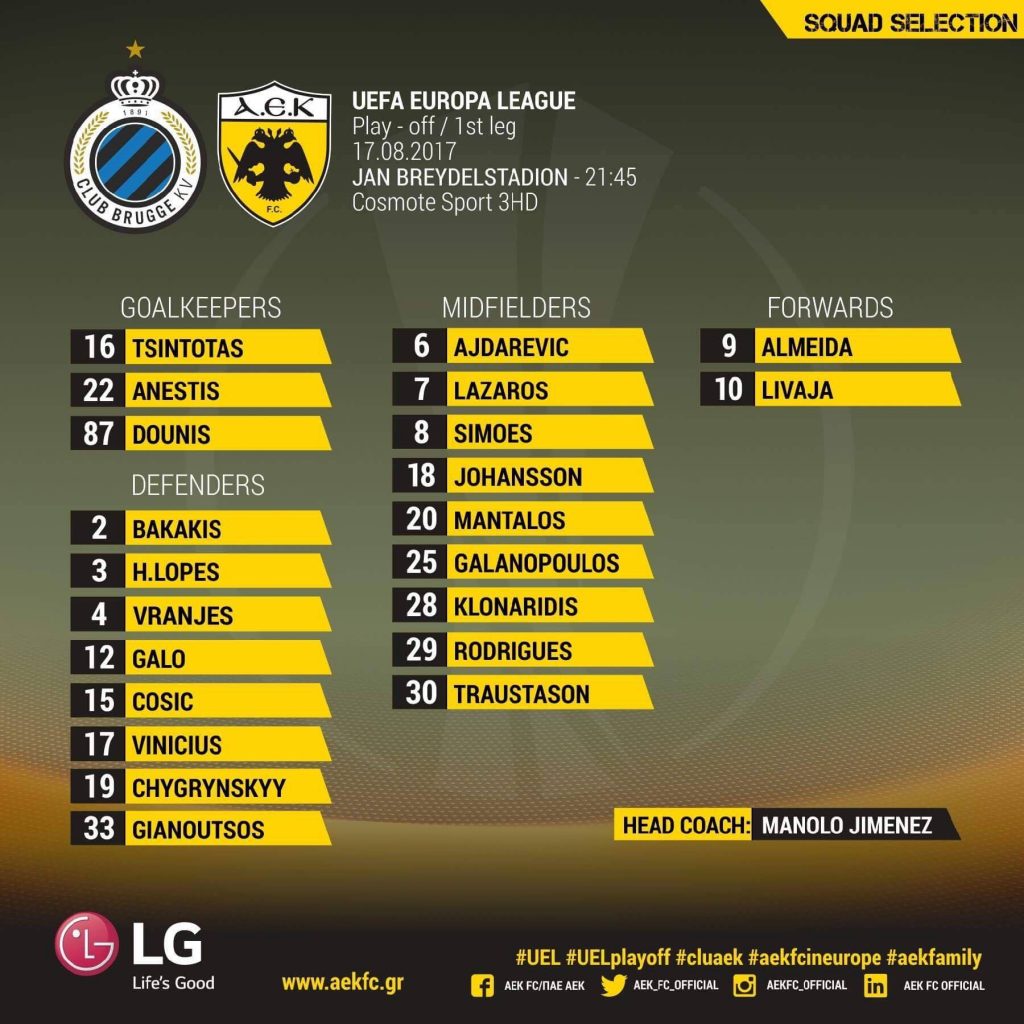 Με τον Όγκνιεν Βράνιες και τον Ρόντριγκο Γκάλο θα ταξιδέψει η ΑΕΚ στο Βέλγιο για το ματς με την Κλάμπ Μπριζ. Χωρίς τον Τάσο Μπακασέτα η αποστολή.