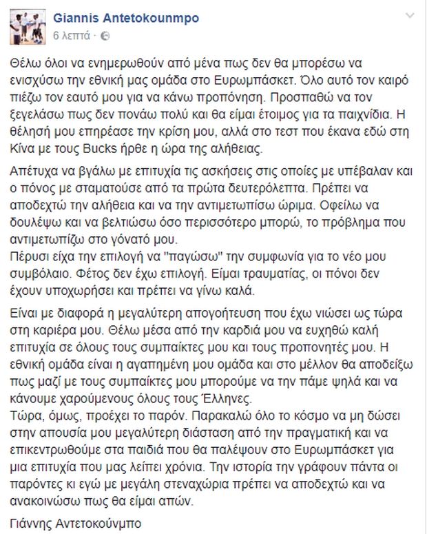 Αυτό που φοβόντουσαν όλοι, έγινε! Ο Γιάννης Αντετοκούνμπο δεν θα ενισχύσει την Εθνική Ανδρών στο EuroBasket λόγω τραυματισμού! Ο σούπερ σταρ των Milwaukee Bucks ενημέρωσε το φίλαθλο μέσω της επίσημης σελίδας του στο Facebook πως δεν θα δώσει το “παρών” αυτό το καλοκαίρι στην “επίσημη αγαπημένη”, αφού εξακολουθεί να πονάει στο γόνατο.