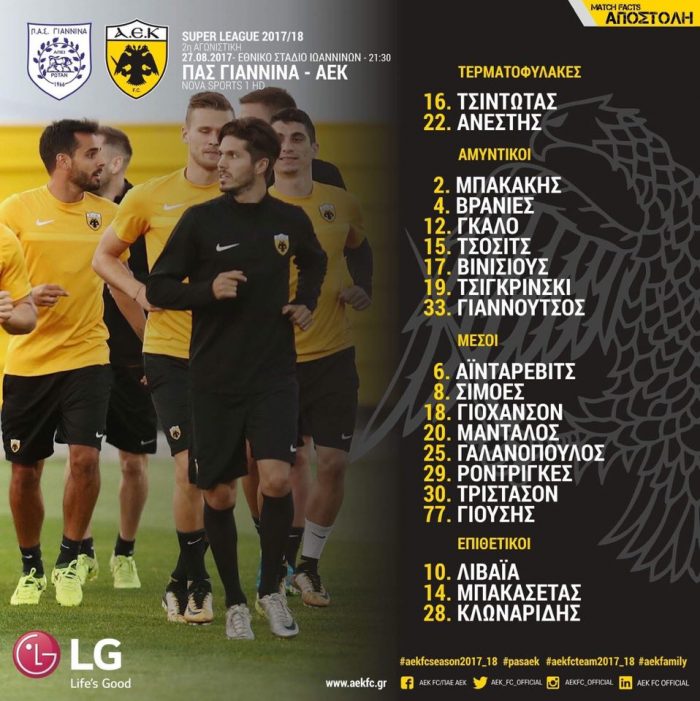 Ο ΠΑΕ ΑΕΚ ανακοίνωσε τους 20 ποδοσφαιριστές που επέλεξε ο Μανόλο Χιμένεθ στην αποστολή για το παιχνίδι με τον ΠΑΣ στα Γιάννενα.