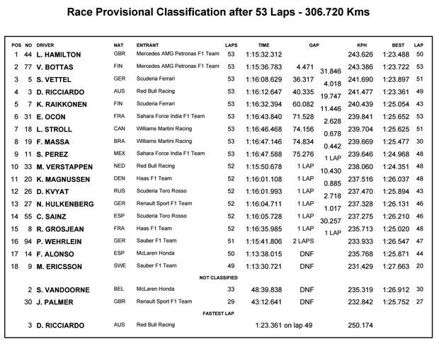 Και το επίτευγμα του Βρετανού πιλότου αποκτά μεγαλύτερη σημασία, αν σκεφτεί κανείς ότι ξεπέρασε στη βαθμολογία τον Vettel μέσα στην ιστορική έδρα της Ferrari, με τον Γερμανό να ανεβαίνει στην τρίτη θέση του βάθρου. Ο ομόσταυλός του Hamilton στην Mercedes, Valtteri Bottas, τερμάτισε δεύτερος, κάνοντας το 1-2 και ολοκλήρωσε την κυριαρχία της γερμανικής ομάδας.