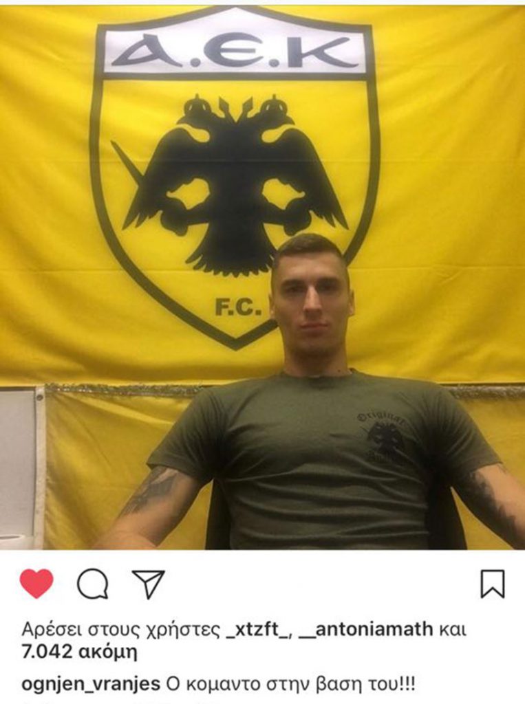 Ο Όγκνιεν Βράνιες με μια φωτογραφία του στο instagram, ενημέρωσε τους διαδικτυακούς του φίλους ότι επέστρεψε στη βάση του “ο κομάντο” όπως λέει χαρακτηριστικά, με την διαφορά βέβαια ότι πίσω του έχει μια σημαία της ΑΕΚ, ενώ φοράει και ένα μπλουζάκι της Original σε χρώμα χακί.