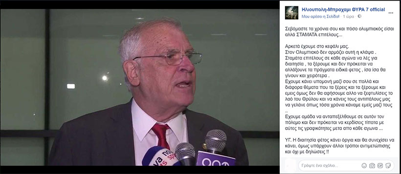 Σε επίθεση κατά του Σάββα Θεοδωρίδη προχώρησε η Θύρα 7 Ηλιούπολη-Μπραχάμι, αναφέροντας μέσα στην ανακοίνωση τους, να σταματήσει την κλάψα για την διαιτησία, τονίζοντας μεταξύ άλλων, ότι έχουν κάνει υπομονή μαζί του σε πολλά και διάφορα θέματα και δεν θα τον αφήσουν να συνεχίσει ξεφτιλίζει την ομάδα τους. Καζάνι που «βράζουν» οι οπαδοί του Ολυμπιακού προς το πρόσωπο του καημένου κυρ Σάββα…