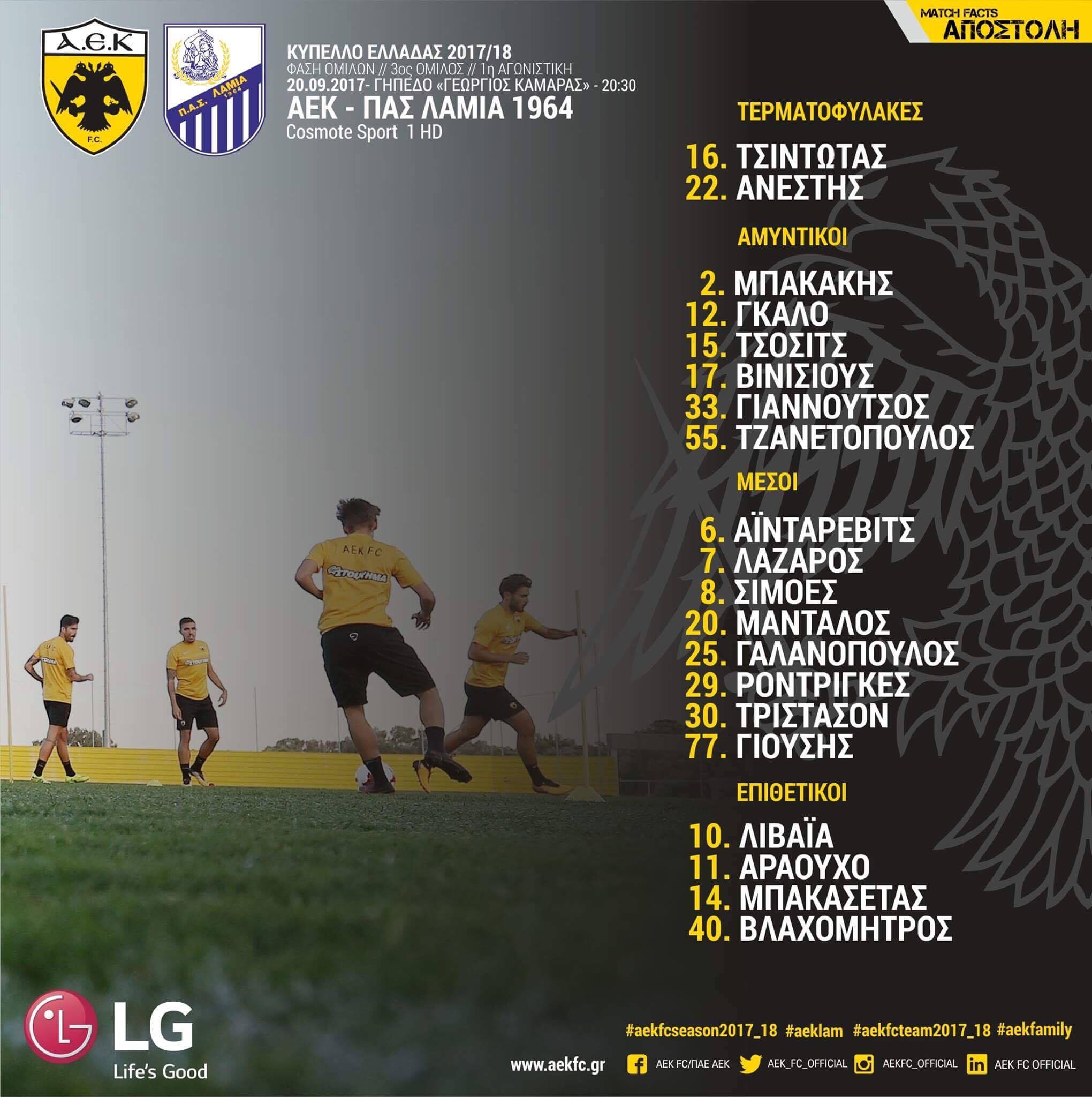 Στην αποστολή της ΑΕΚ βρίσκονται 20 ποδοσφαιριστές: Τσιντώτας, Ανέστης, Μπακάκης, Γκάλο, Τσόσιτς, Βινίσιους, Γιαννούτσος, Τζανετόπουλος, Αϊντάρεβιτς, Λάζαρος, Σιμόες, Μάνταλος, Γαλανόπουλος, Ροντρίγκες, Τρίστασον, Γιούσης, Λιβάγια, Αραούχο, Μπακασέτας, Βλαχομήτρος.