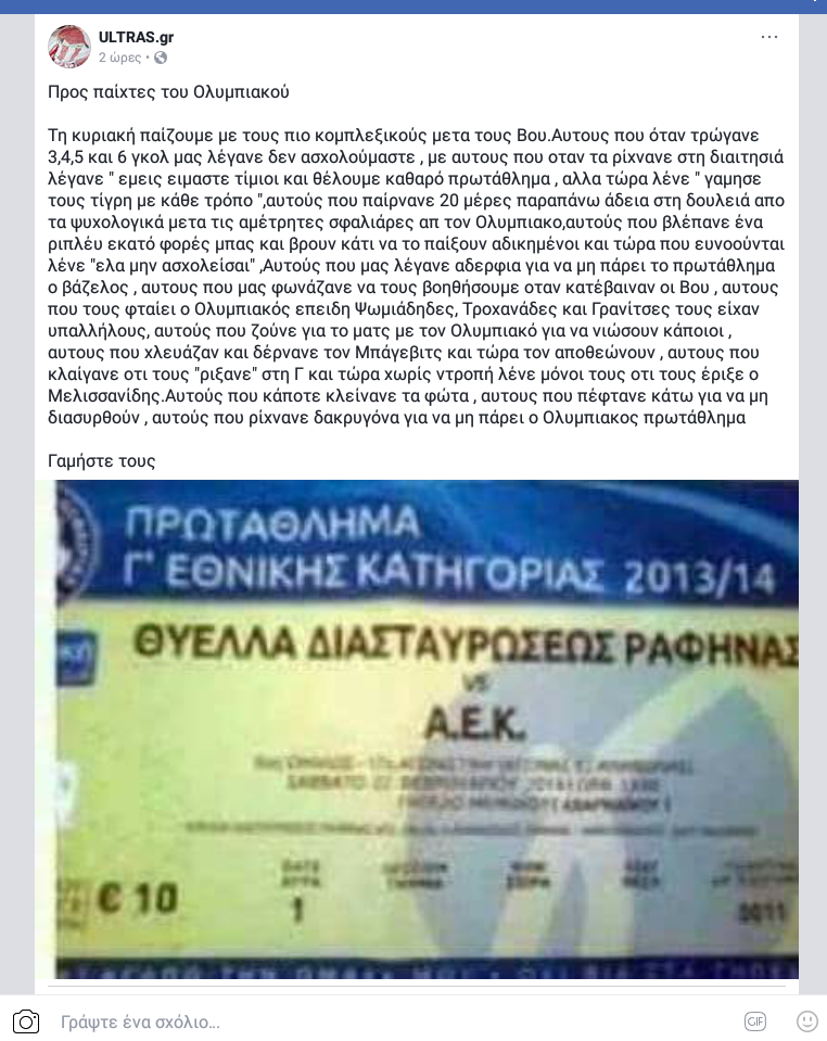 Αντίστροφα μετράει ο χρόνος για το μεγάλο ντέρμπι της 5ης αγωνιστικής της Super League Σουρωτή, μεταξύ της ΑΕΚ και του Ολυμπιακού – Η κλάψα απ’ την ερυθρόλευκη παράγκα συνεχίζεται και αυτή τη φορά θέση παίρνουν οπαδοί της Πειραιώτικης ομάδας με απίστευτες προκλήσεις προς στην ΑΕΚ και τον κόσμο της.