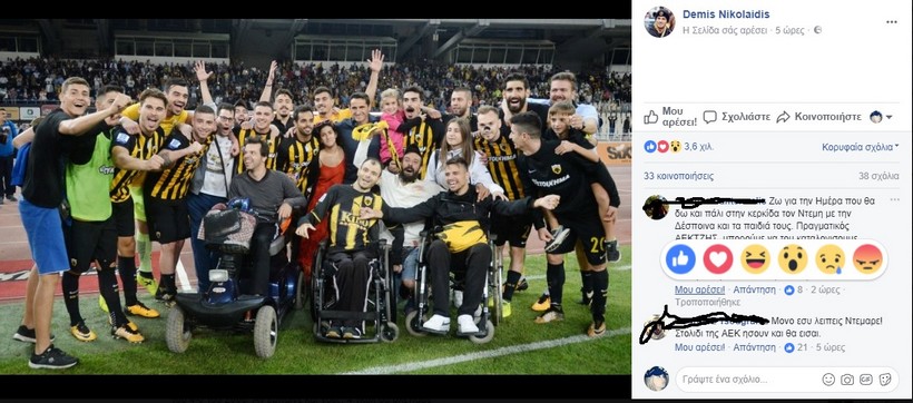Ανάμεσα στον κόσμο που πανηγύριζε ήταν και ο Ντέμης Νικολαΐδης, ο οποίος ανέβασε φωτογραφία στο Facebook, με τους πανηγυρισμούς της ομάδας, με τα παιδιά που βρίσκονται σε αναπηρικό καροτσάκι.