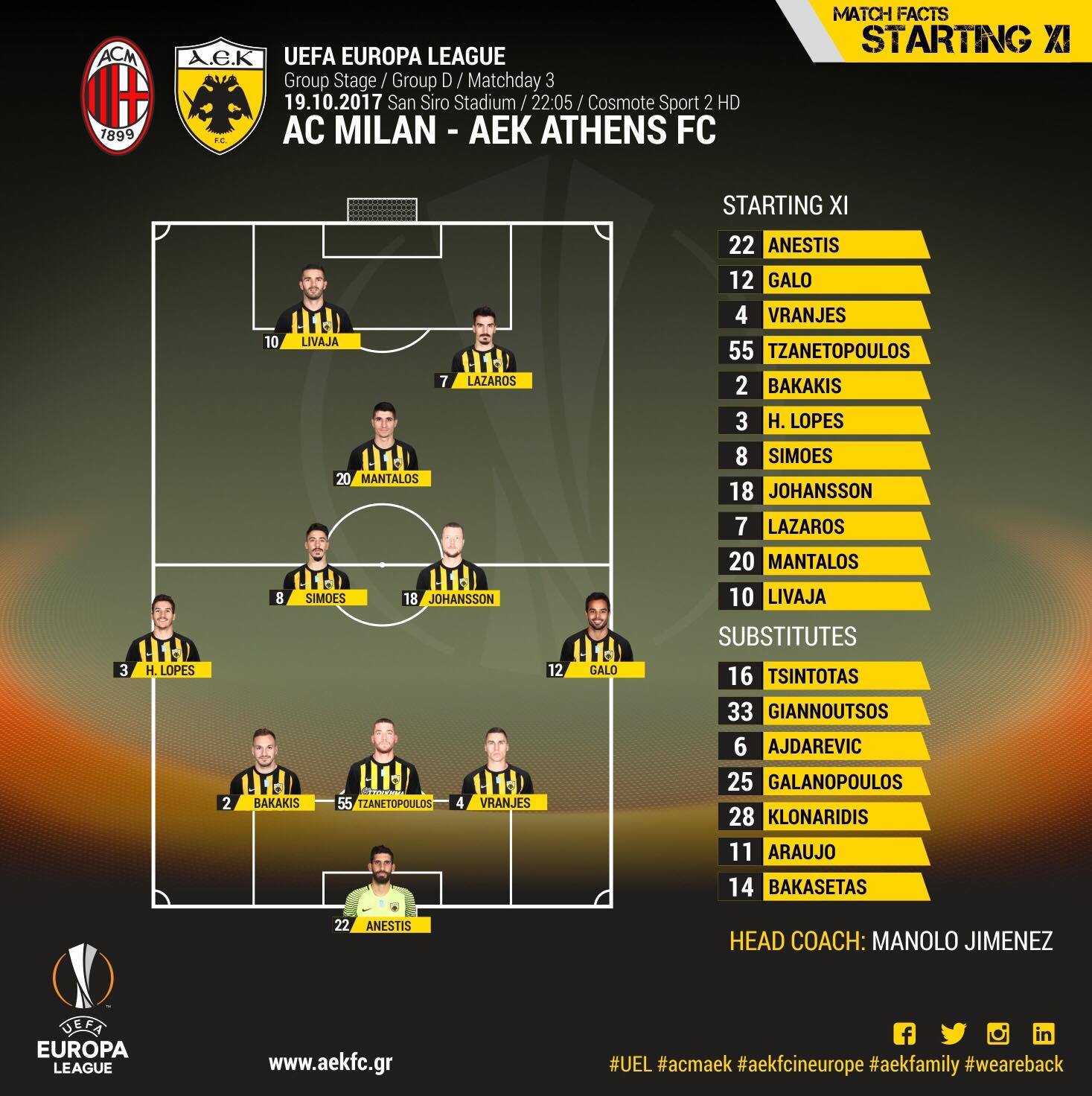 Η εντεκάδα της ΑΕΚ αποτελείται απ’ τους: Ανέστη, Μπακάκη, Τζανετόπουλο, Βράνιες, Γκάλο, Λόπες, Γιόχανσον, Σιμόες, Μάνταλος, Λάζαρος, Λιβάγια.