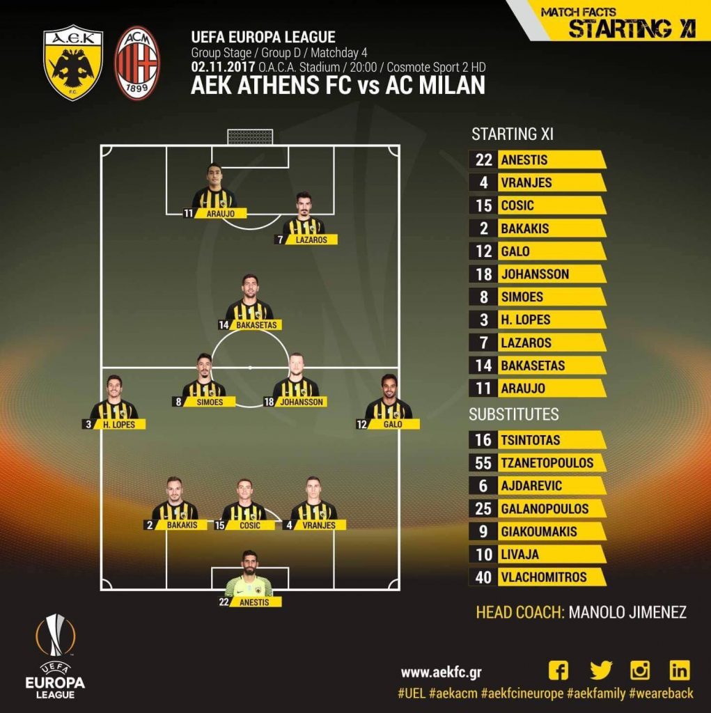 Η εντεκάδα της ΑΕΚ αποτελείται απ’ τους: Ανέστης, Βράνιες, Τσόσιτς, Μπακάκης, Γκάλο, Λόπες, Σιμόες, Γιόχανσον, Μπακασέτας, Λάζαρος, Αραούχο.