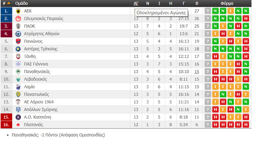 Δείτε πως διαμορφώνεται η βαθμολογία για την 13η αγωνιστική της Super League ΣΟΥΡΩΤΗ