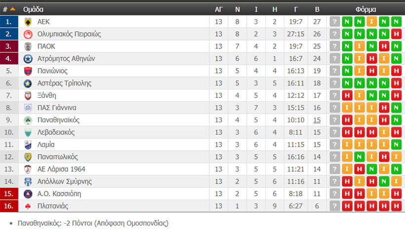 Δείτε πως διαμορφώνεται η βαθμολογία για την 13η αγωνιστική της Super League ΣΟΥΡΩΤΗ