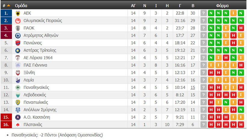 Δείτε πως διαμορφώνεται η βαθμολογία για την 14η αγωνιστική της Super League ΣΟΥΡΩΤΗ