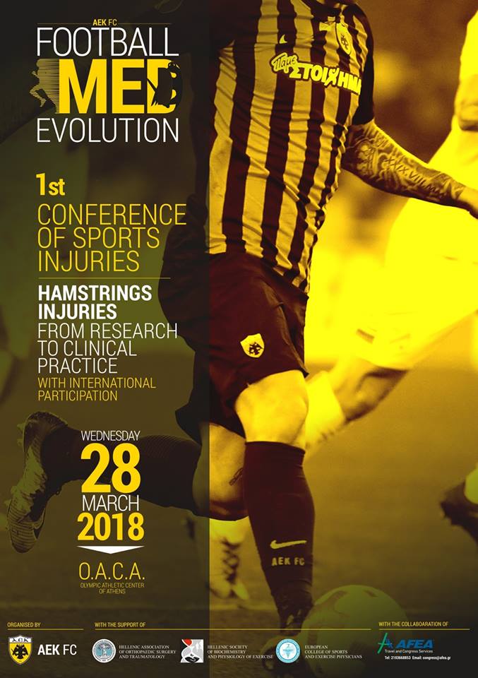 «Η ΠΑΕ ΑΕΚ διοργανώνει την 1η ημερίδα αθλητικών κακώσεων (1st Conference of Sports Injuries) με θέμα «Μυϊκές θλάσεις οπίσθιων μηριαίων: από την έρευνα στην κλινική πράξη» στις 28 Μαρτίου 2018 στο Ολυμπιακό Στάδιο με τη συμμετοχή Ελλήνων και ξένων ομιλητών όλων των σχετικών ειδικοτήτων.Η πρόσκληση απευθύνεται σε αθλητές, ιατρούς, γυμναστές αποκατάστασης, φυσιοθεραπευτές και εργοφυσιολόγους για τη σπουδαία αυτή επιστημονική εκδήλωση, η οποία διοργανώνεται για πρώτη φορά στη χώρα μας από ποδοσφαιρικό σύλλογο.