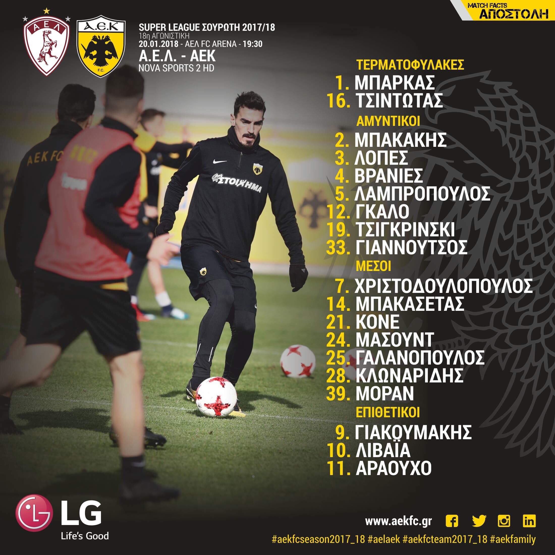 Οι εκλεκτοί του προπονητή της ΑΕΚ είναι οι: Τσιντώτας, Μπάρκας, Μπακάκης, Γκάλο, Λαμπρόπουλος, Βράνιες, Τσιγκρίνσκι, Λόπες, Γιαννούτσος, Γαλανόπουλος, Μοράν, Χριστοδουλόπουλος, Κονέ, Κλωναρίδης, Μασούντ, Λιβάια, Μπακασέτας, Αραούχο, Γιακουμάκης.
