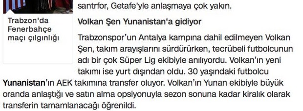 Μάλιστα σήμερα, το CNN TURK τονίζει ότι ο Βολκάν Σεν δεν συμμετέχει στη χειμερινή προετοιμασία της ομάδας του και ψάχνει τον επόμενο σταθμό στην καριέρα του, αποκαλύπτοντας ότι παρά τις προτάσεις από συλλόγους της Τουρκίας, ο διεθνής εξτρέμ θα μετακομίσει στην Ελλάδα.