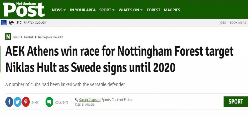 Δημοσίευμα της Nottingham Post αναφέρει ότι: «Η ΑΕΚ κέρδισε την κούρσα για τον στόχο της Νότιγχαμ Φόρεστ, τον Χουλτ», ενώ παράλληλα γράφει ότι για τον παίκτη ενδιαφέρθηκαν και οι ΠΑΟΚ, Μπρόντμπι, Άντερλεχτ και Ολυμπιακός.