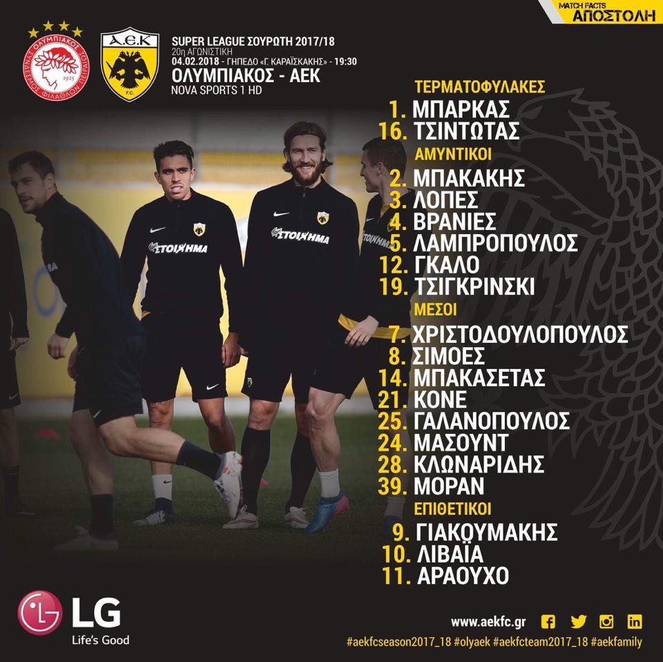 Οι εκλεκτοί του προπονητή της ΑΕΚ είναι οι Τσιντώτας, Μπάρκας, Μπακάκης, Γκάλο, Λαμπρόπουλος, Βράνιες, Τσιγκρίνσκι, Λόπες, Σιμόες, Γαλανόπουλος, Μοράν, Κονέ, Χριστοδουλόπουλος, Κλωναρίδης, Μασούντ, Λιβάια, Μπακασέτας, Γιακουμάκης, Αραούχο.