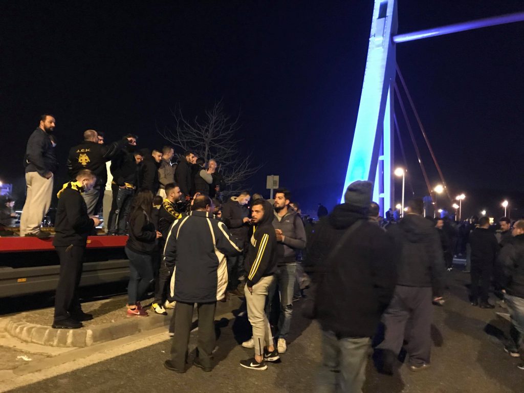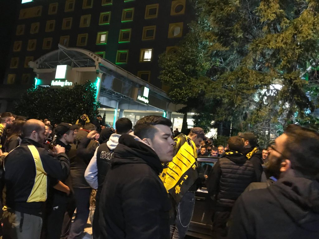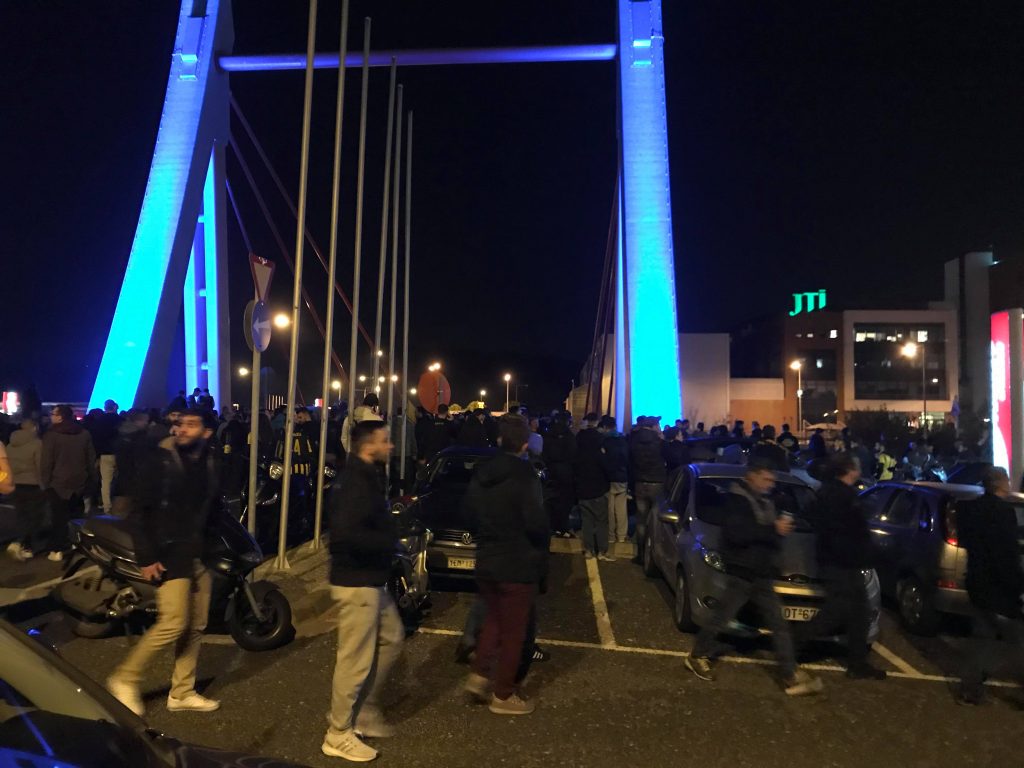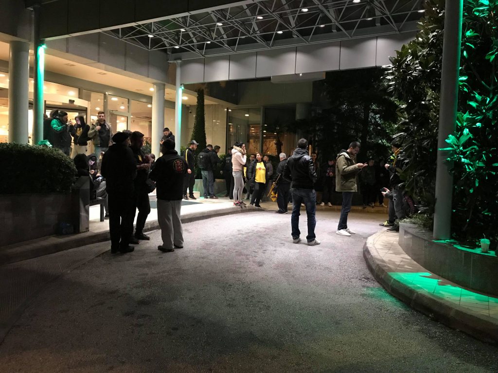 *Πάνω από 1200 φίλοι της ΑΕΚ στο ξενοδοχείο έχουν κάνει τη νύχτα μέρα και περιμένουν τους θριαμβευτές απ’ το Φαληρικό γήπεδο.