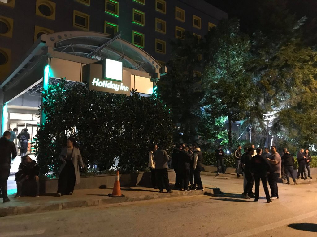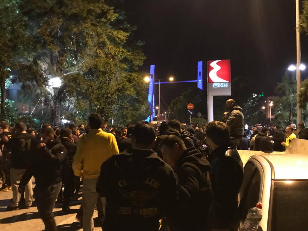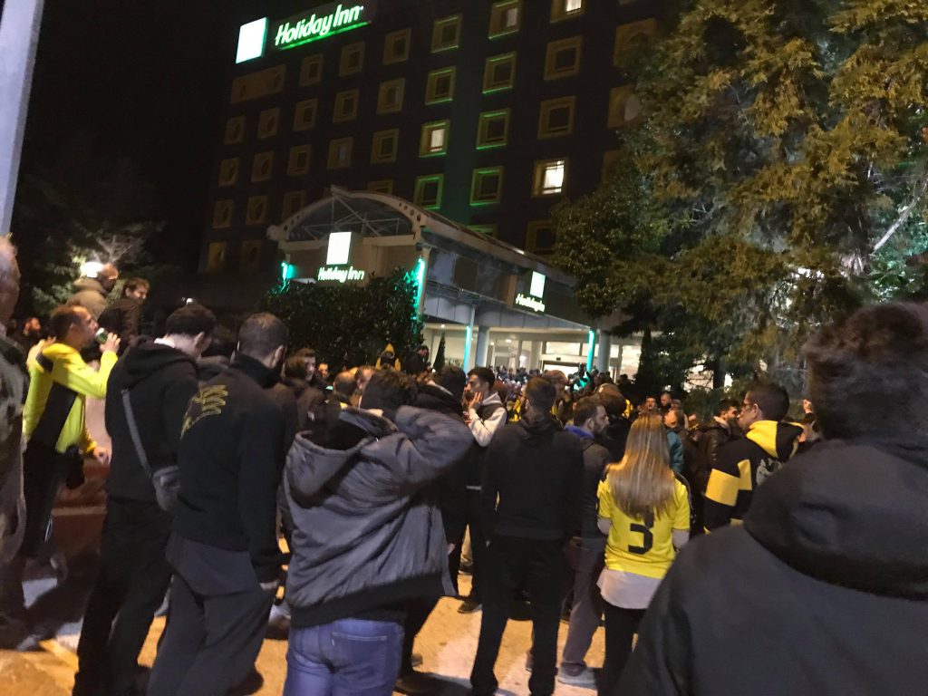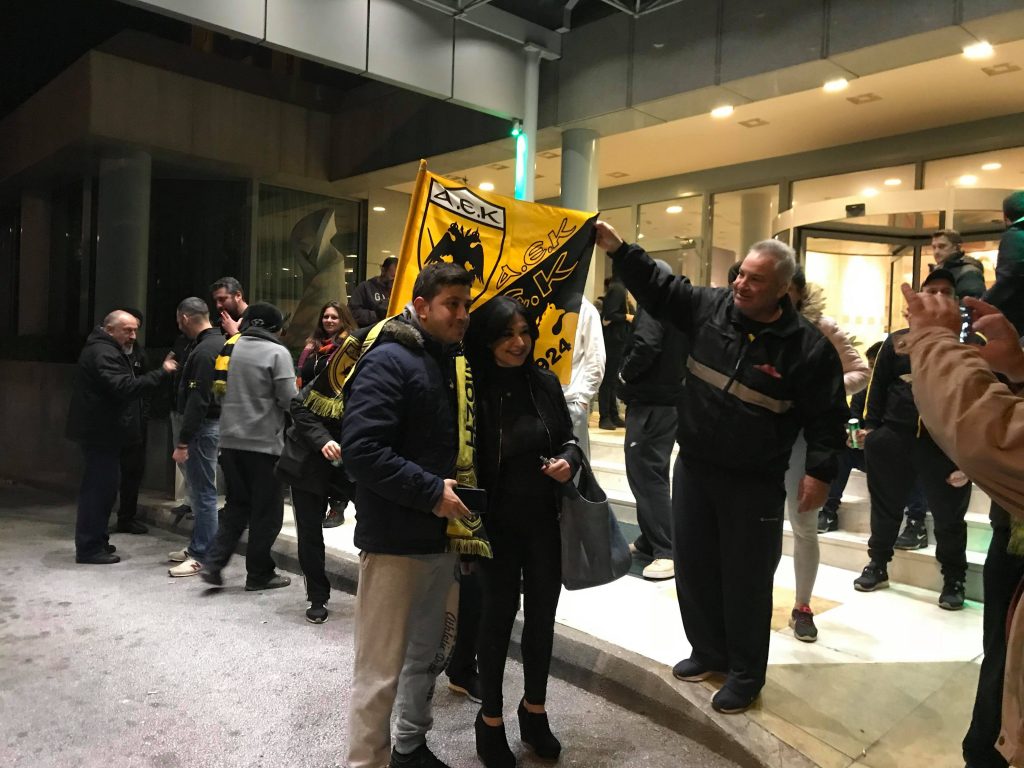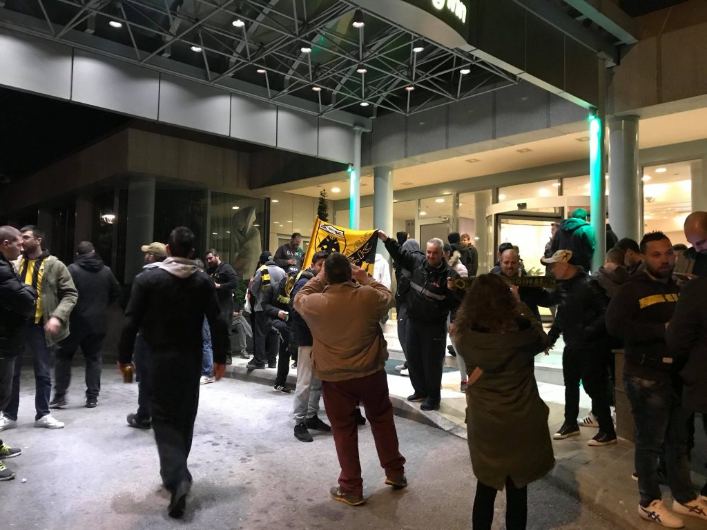 *Πάνω από 1200 φίλοι της ΑΕΚ στο ξενοδοχείο έχουν κάνει τη νύχτα μέρα και περιμένουν τους θριαμβευτές απ’ το Φαληρικό γήπεδο.