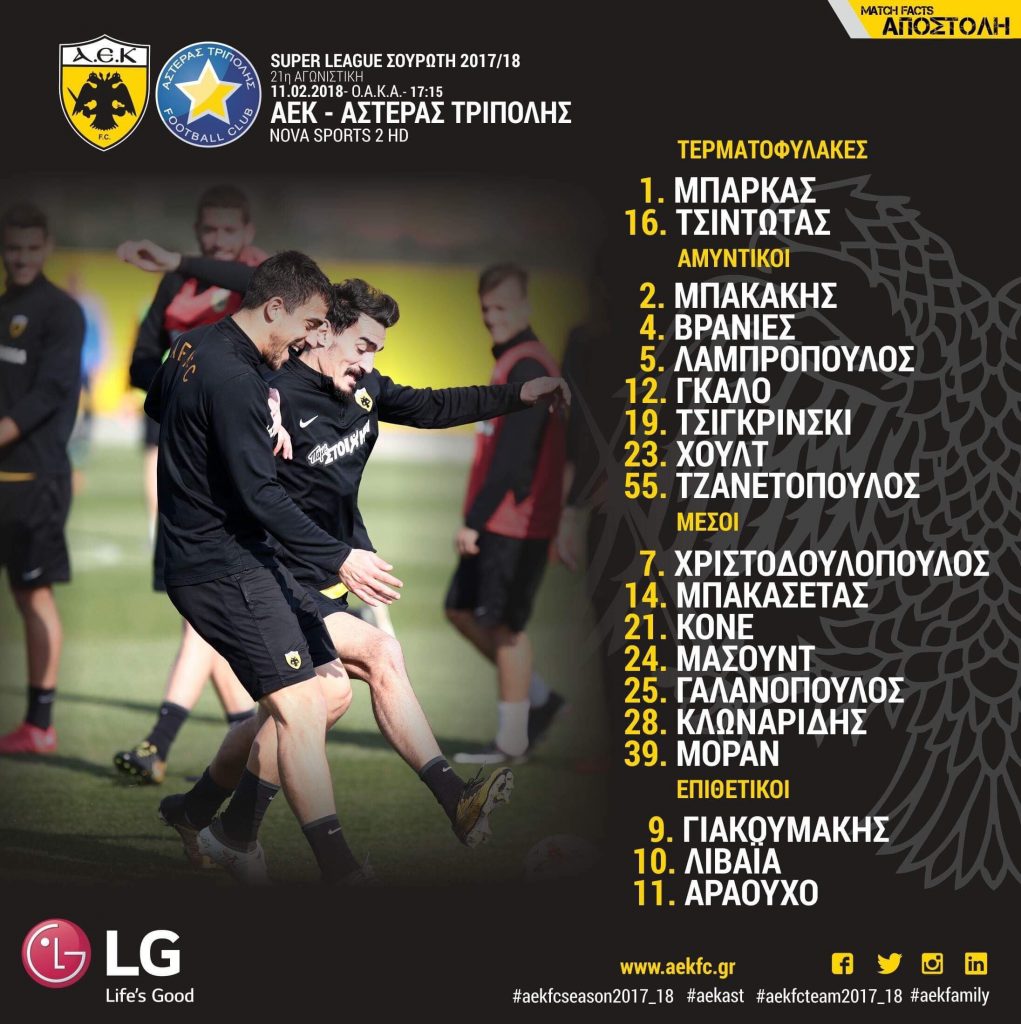 Η αποστολή της ΑΕΚ αποτελείται απ’ τους Μπάρκας, Τσιντώτας, Μπακάκης, Βράνιες, Λαμπρόπουλος, Γκάλο, Τσιγκρίνσκι, Τζανετόπουλος, Χουλτ, Χριστοδουλόπουλος, Κονέ, Μασούντ, Γαλανόπουλος, Κλωναρίδης, Μοράν, Αραούχο, Γιακουμάκης, Λιβάγια.