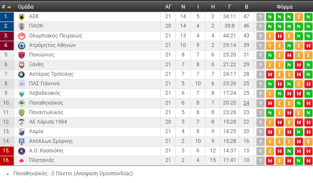 Από την άλλη ο Ολυμπιακός πήρε στα τελευταία λεπτά το βαθμό της ισοπαλίας στο Περιστέρι και περιμένει πλέον την αυριανή δικαστική απόφαση για τα επεισόδια στο «Γ.Καραϊσκάκης» με το κίνδυνο για αφαίρεση βαθμών να είναι ορατός. Τέλος ο Παναθηναϊκός παραπαίει, χάνοντας και από τον ΠΑΣ Γιάννενα.