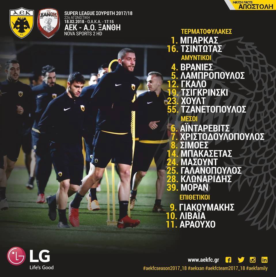 Οι εκλεκτοί του προπονητή της ΑΕΚ είναι οι Τσιντώτας, Μπάρκας, Γκάλο, Λαμπρόπουλος, Βράνιες, Τσιγκρίνσκι, Τζανετόπουλος, Χουλτ, Σιμόες, Μοράν, Γαλανόπουλος, Αϊντάρεβιτς, Χριστοδουλόπουλος, Μασούντ, Κλωναρίδης, Μπακασέτας, Λιβάια, Γιακουμάκης, Αραούχο.