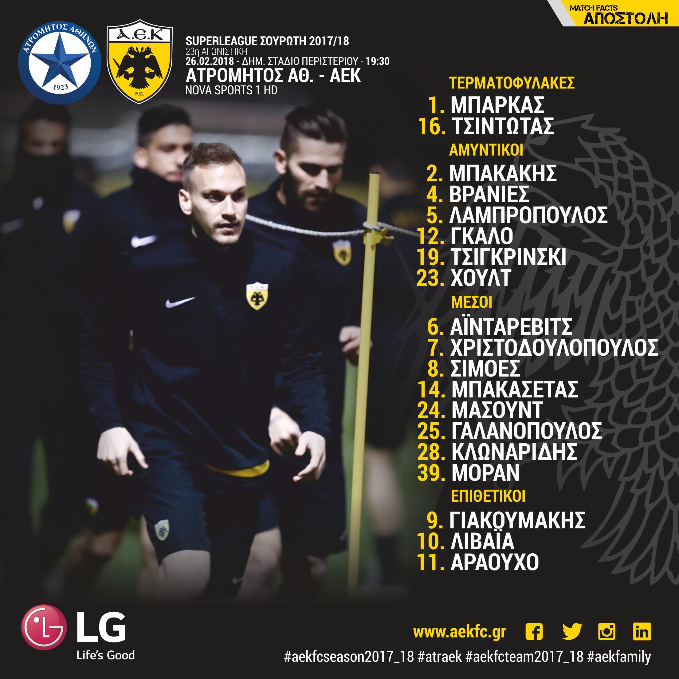 Λίγο μετά την προπόνηση της Κυριακής ο Ανδαλουσιανός τεχνικός της ΑΕΚ επέλεξε 19 διαθέσιμους ποδοσφαιριστές για την μάχη της Δευτέρας στο Περιστέρι απέναντι στον Ατρόμητο.