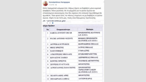 Ο Διευθυντής Επικοινωνίας της ΠΑΕ Ολυμπιακός, Κωνσταντίνος Καραπαπάς ανέβασε στο λογαριασμό του στο facebοok το φύλλο αγώνα στο οποίο αναφέρονται ποιοι ήταν δηλωμένοι για τον πάγκο της ομάδας στο ματς της Τούμπας.