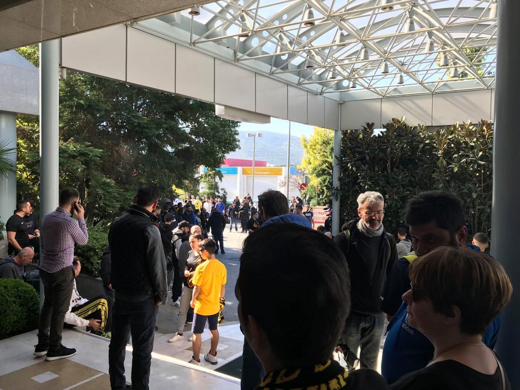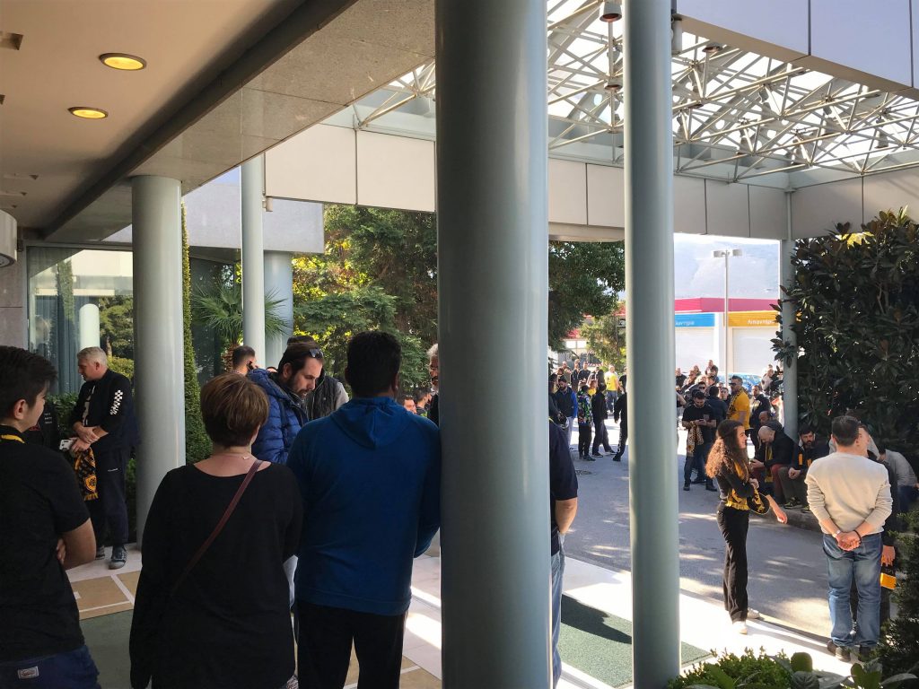 Συγκεντρώνεται ο κόσμος έξω από το ξενοδοχείο όπου διαμένει η αποστολή της ΑΕΚ με στόχο να τους συνοδέψουν μέχρι το «Ελ.Βενιζέλος», στέλνοντας τους στην μάχη που (κατά πάσα πιθανότητα) θα κρίνει το πρωτάθλημα.