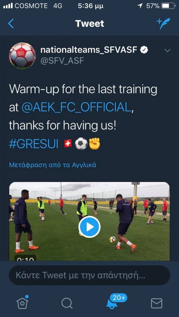 Συγκεκριμένα, η Εθνική Ελβετίας και τις δυο μέρες που προπονήθηκαν στα Σπάτα έμεινε πλήρως ικανοποιημένοι απ’ την φιλοξενία της Ένωσης και τις παροχές που τους παρείχαν με αποτέλεσμα, να την «ευχαριστήσουν» μέσω του επίσημου λογαριασμού τους στα social media, ανεβάζοντας ένα απόσπασμα απ’ την προπόνηση απ’ το προπονητικό κέντρο.
