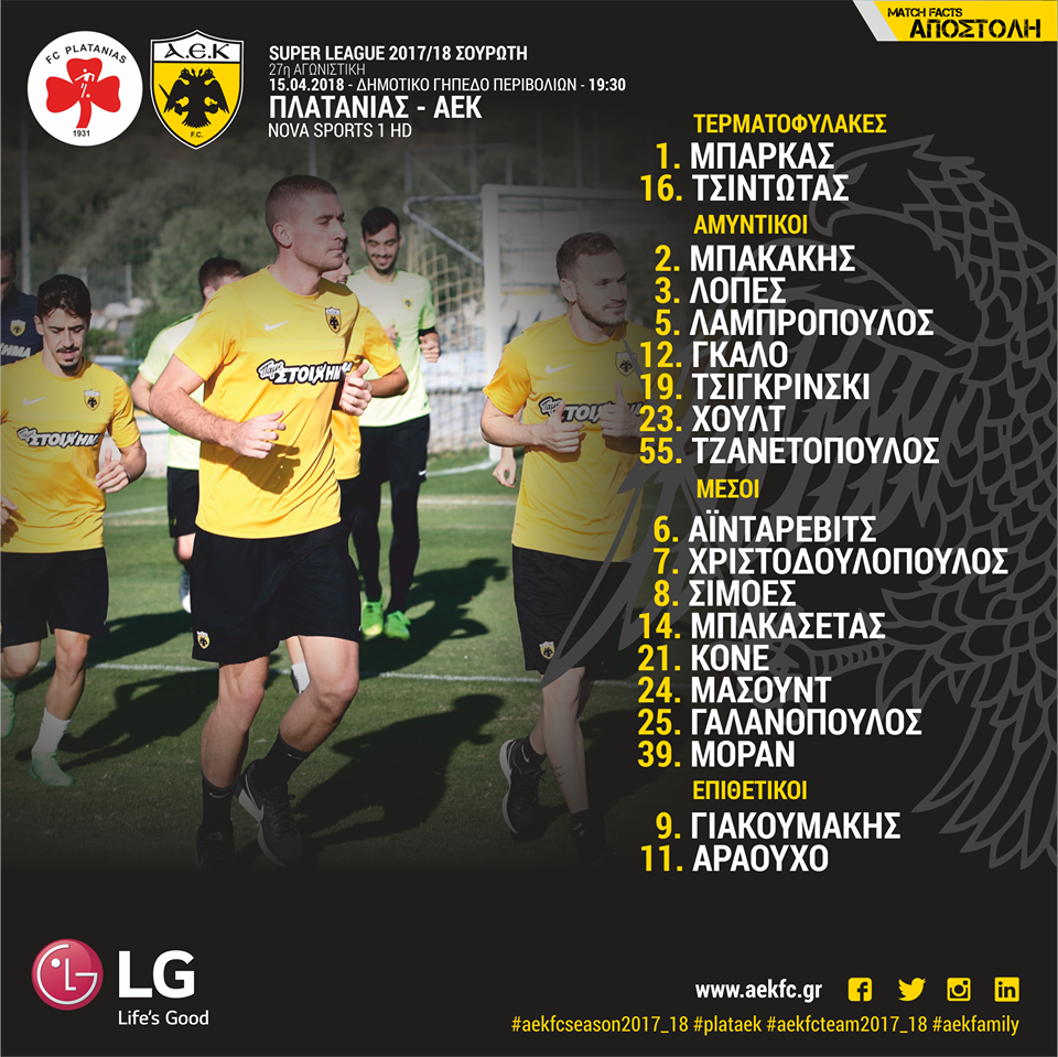 Απ’ εκεί και έπειτα ο Μανόλο Χιμένεθ για το ματς με τον Πλατανιά επέλεξε 19μελή αποστολή που θα πετάξει στις 5 απ’ την Αθήνα για τα Χανιά και αποτελείται απ’ τους: Μπάρκα, Τσιντώτα, Μπακάκη, Λαμπρόπουλο, Γκάλο, Λόπες, Τσιγκρίνσκι, Χουλτ, Τζανετόπουλος, Αϊντάρεβιτς, Λάζαρος, Σιμόες, Μπακασέτας, Κονέ, Μασούντ, Γαλανόπουλος, Μοράν, Γιακουμάκης, Αραούχο.