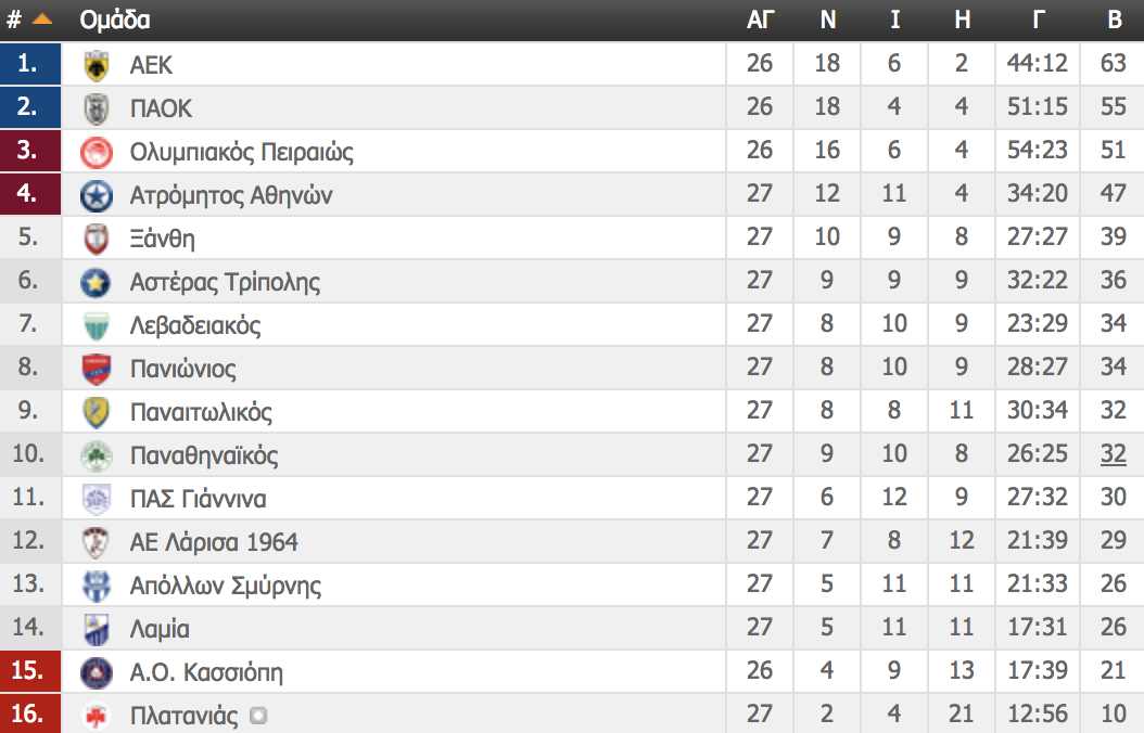 Τα αποτελέσματα και η βαθμολογία της 27ης αγωνιστικής της Super League μετά τη νίκη της ΑΕΚ στα Χανιά
