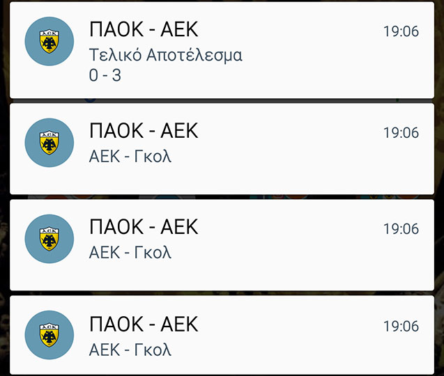 Η ΠΑΕ ΑΕΚ με επικό τρόπο, επικύρωσε το σκορ της Τούμπας, μέσα απ’ την εφαρμογή της ομάδας για smartphone, στέλνοντας τις ειδοποιήσεις για τα γκολ της ομάδας και το τελικό αποτέλεσμα, 0-3.