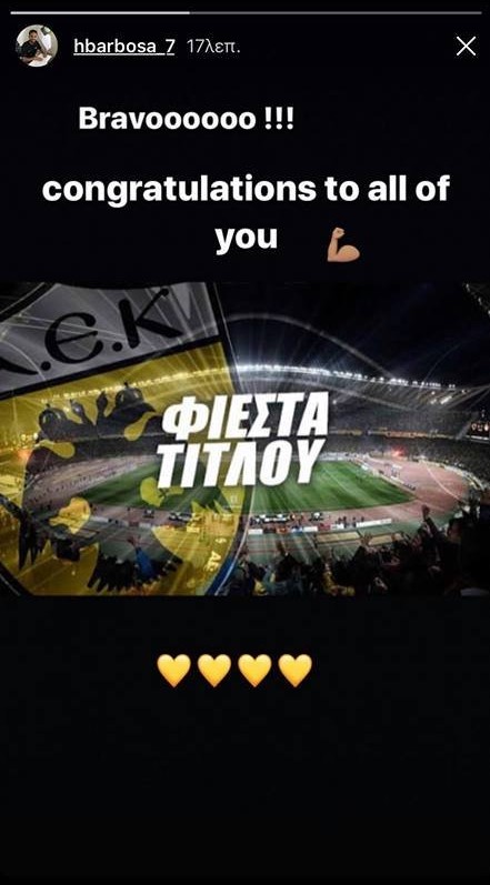 Ο Έλντερ Μπαρμπόσα δεν ξέχασε την προηγούμενη του ομάδα και έστειλε τα δικά του συγχαρητήρια μέσω των social media στην ΑΕΚ και στους πρώην συμπαίκτες-φίλους του.