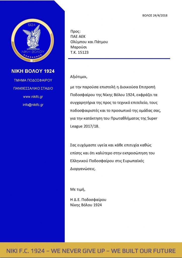με την παρούσα επιστολή η Διοικούσα Επιτροπή Ποδοσφαίρου της Νίκης Βόλου 1924, εκφράζει τα συγχαρητήρια της προς το τεχνικό επιτελείο, τους ποδοσφαιριστές και το προσωπικό της ομάδας σας, για την κατάκτηση του Πρωταθλήματος της Super League 2017/18.
