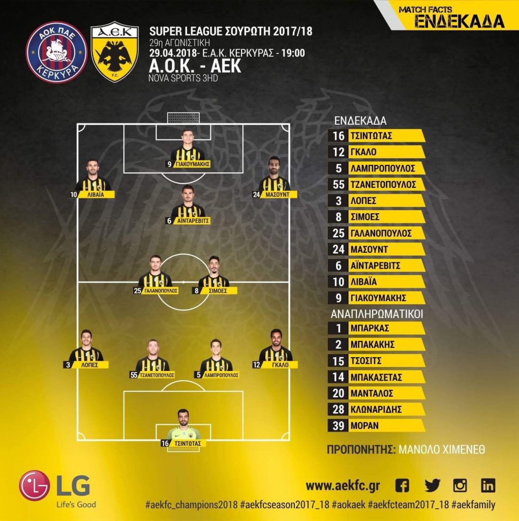Τα δυο κεντρικά χαφ θα είναι οι Σιμόες και Γαλανόπουλος, μπροστά τους ο Αϊντάρεβιτς, δεξιά ο Μασούντ και αριστερά ο Λιβάγια, ενώ στην επίθεση της ΑΕΚ ο Γιακουμάκης.