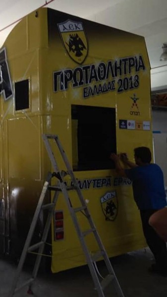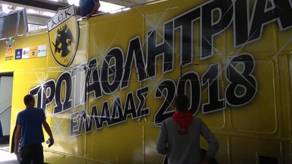 Το πούλμαν θα γράφει πάνω “Πρωταθλήτρια Ελλάδας 2018” έχοντας το σήμα της ΑΕΚ, ενώ στο πίσω μέρος θα γράφει κάτω χαμηλά “Τα καλύτερα έρχονται”.