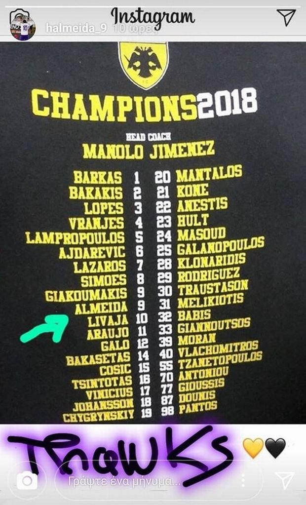 Ο Ούγκο Αλμέιδα ξεκίνησε τη σεζόν με την ΑΕΚ, ωστόσο λίγο πριν την ολοκήρωση της μεταγραφικής περιόδου αποχώρησε από την ομάδα. Η προσφορά του Πορτογάλου εκτιμήθηκε από τους Κιτρινόμαυρους, οι οποίοι στο μπλουζάκι της φιέστας είχαν γράψει και το όνομα του στη λίστα, με τον ίδιο να ευχαριστεί γι αυτήν την κίνηση.