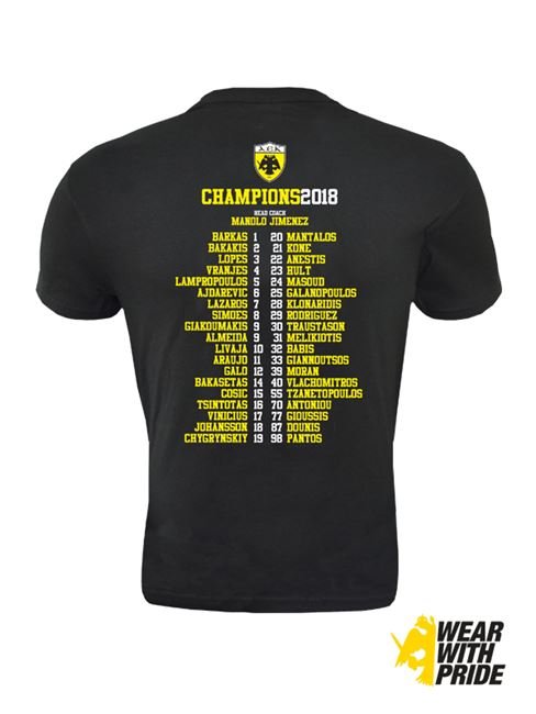Διαθέσιμο στο aekfc e-shop είναι το μπλουζάκι που φορούσε όλη η ομάδα κατά την ώρα της στέψης στο στάδιο της Ριζούπολης, αλλά και στην παρέλαση της Νέας Φιλαδέλφειας.
