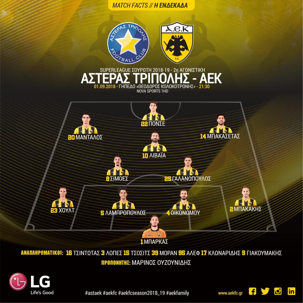 Η ενδεκάδα της ΑΕΚ αποτελείται απ’ τους: Μπάρκα, Μπακάκη, Λαμπρόπουλο, Οικονόμου, Χουλτ, Σιμόες, Γαλανόπουλος, Μπακασέτας, Λιβάγια, Μάνταλος, Πόνσε.