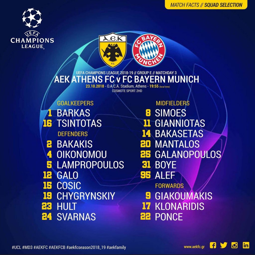 Η αποστολή της ΑΕΚ αποτελείται απ’ τους: Μπάρκας, Τσιντώτας, Μπακάκης, Γκάλο, Οικονόμου, Λαμπρόπουλος, Τσόσιτς, Τσιγκρίνσκι, Χουλτ, Σβάρνας, Σιμόες, Κλωναρίδης, Μάνταλος, Γαλανόπουλος, Άλεφ, Γιακουμάκης, Γιαννιώτας, Μπακασέτας, Πόνσε, Μπογέ.