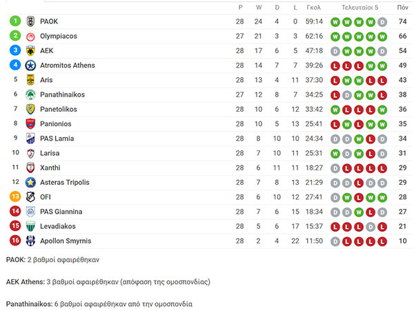 Δείτε πως διαμορφώνεται η βαθμολογία για την 28η αγωνιστική της Super League ΣΟΥΡΩΤΗ. Δεν το κλείδωσε ακόμα μαθηματικά ο ΠΑΟΚ το πρωτάθλημα, στη Football League υποβιβάστηκε ο Λεβαδειακός.