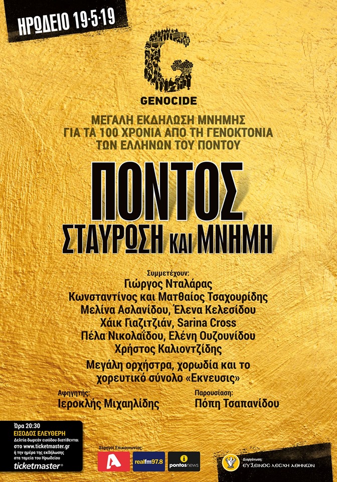 Αύριο το βράδυ με ώρα έναρξης 20.30 διοργανώνεται στο Ηρώδειο η μεγάλη εκδήλωση για τα 100 χρόνια από τη Γενοκτονία των Ελλήνων του Πόντου, ένα από τα μεγαλύτερα εγκλήματα στην ιστορία των ανθρωπότητας.