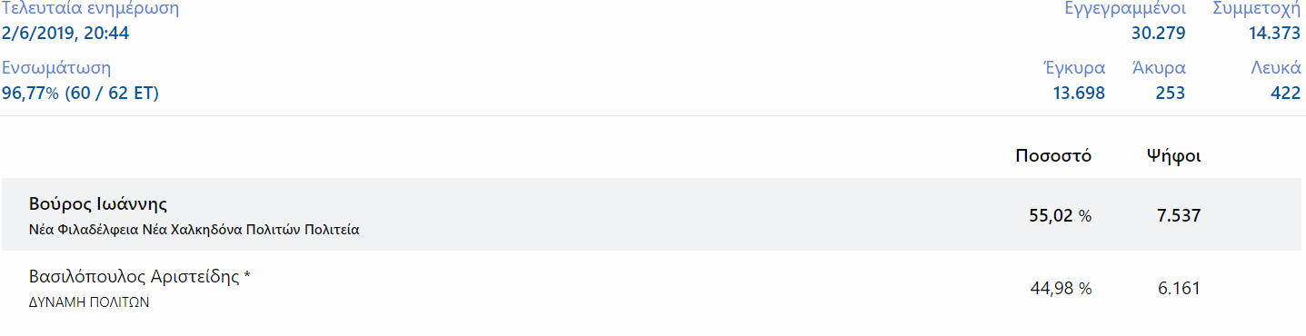 Με ενσωμάτωση σχεδόν στο 100%, ο Βούρος εκλέγεται πανηγυρικά Δήμαρχος της Νέας Φιλαδέλφειας-Χαλκηδόνας με 55% και ο Άρης Βασιλόπουλος αρκετά πίσω (45%) με 10 μονάδες διαφορά.