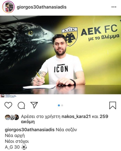 Λίγες ώρες μετά τις υπογραφές, την παρουσίαση αλλά και τις δηλώσεις του Γιώργου Αθανασιάδη, δημοσίευσε μια φωτογραφία στο Instagram, σηματοδοτώντας την αλλαγή σελίδας στην καριέρα του.