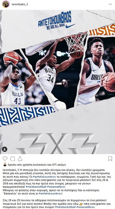 Η επιτυχία δεν κοιτάζει σύνορα και ηλικίες, δεν κοιτάζει χρώματα. Μιλά μία και μοναδική γλώσσα, αυτή της σκληρής δουλειάς και της συγκέντρωσης σε αυτό που κάνεις! Οι #antetokounbros το κατάφεραν, ενωμένοι. Γιατί όχι και ‘συ; Δήλωσε συμμετοχή στο nike.com/giannis για το τουρνουά μπάσκετ 3×3 στις 28 & 29/6 και απόδειξε πως τα πιο τρελά σου όνειρα, μπορούν να γίνουν πραγματικότητα! #nikebasketball #weareallbros